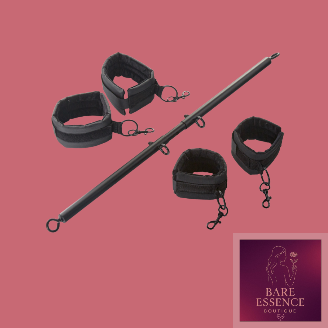 Submit to lust and bare it all with this spreader bar and cuff set. The four included cuffs and expandable bar allow for simple control or a variety of compromising positions.