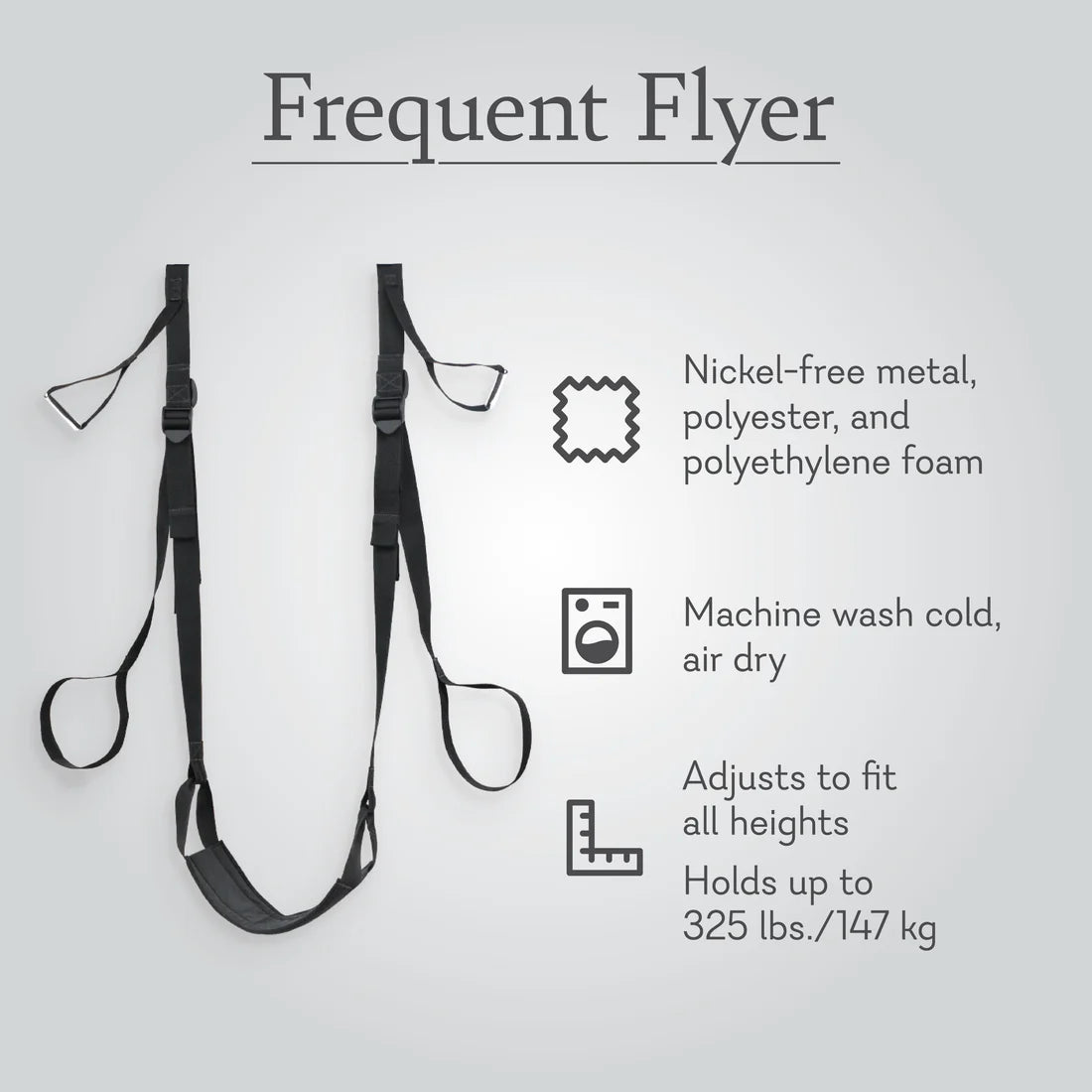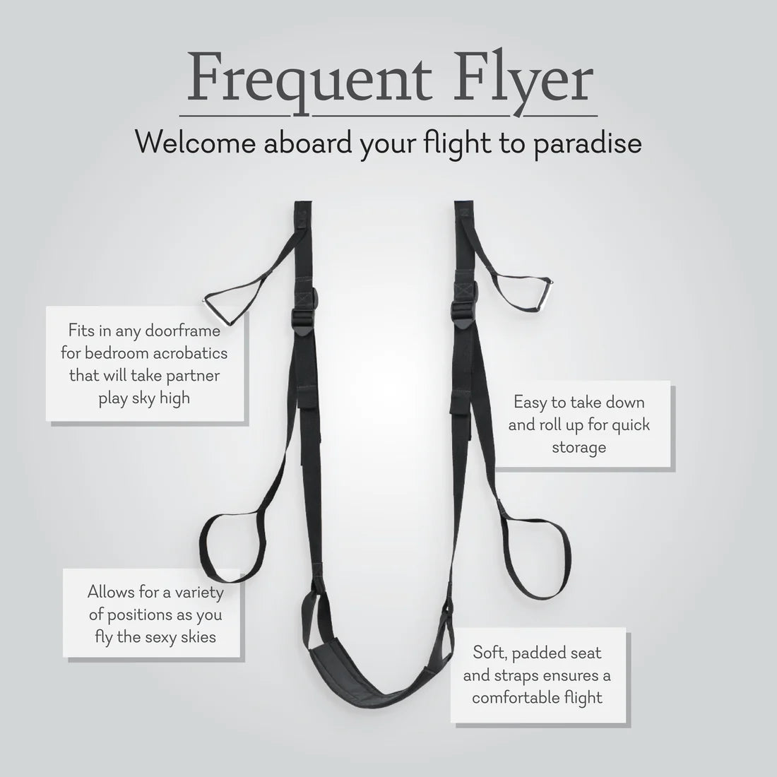 Welcome aboard your non-stop flight to paradise. The Frequent Flier Door Swing fits in any doorframe for bedroom acrobatics that’ll take partner play up to a whole new level. Have a seat, position the straps, and you’re ready for take-off. Move in ways you never imagined or ask your co-pilot to take hold of the seat to angle your hips for ultimate satisfaction. Your Mile-High Club membership awaits.
